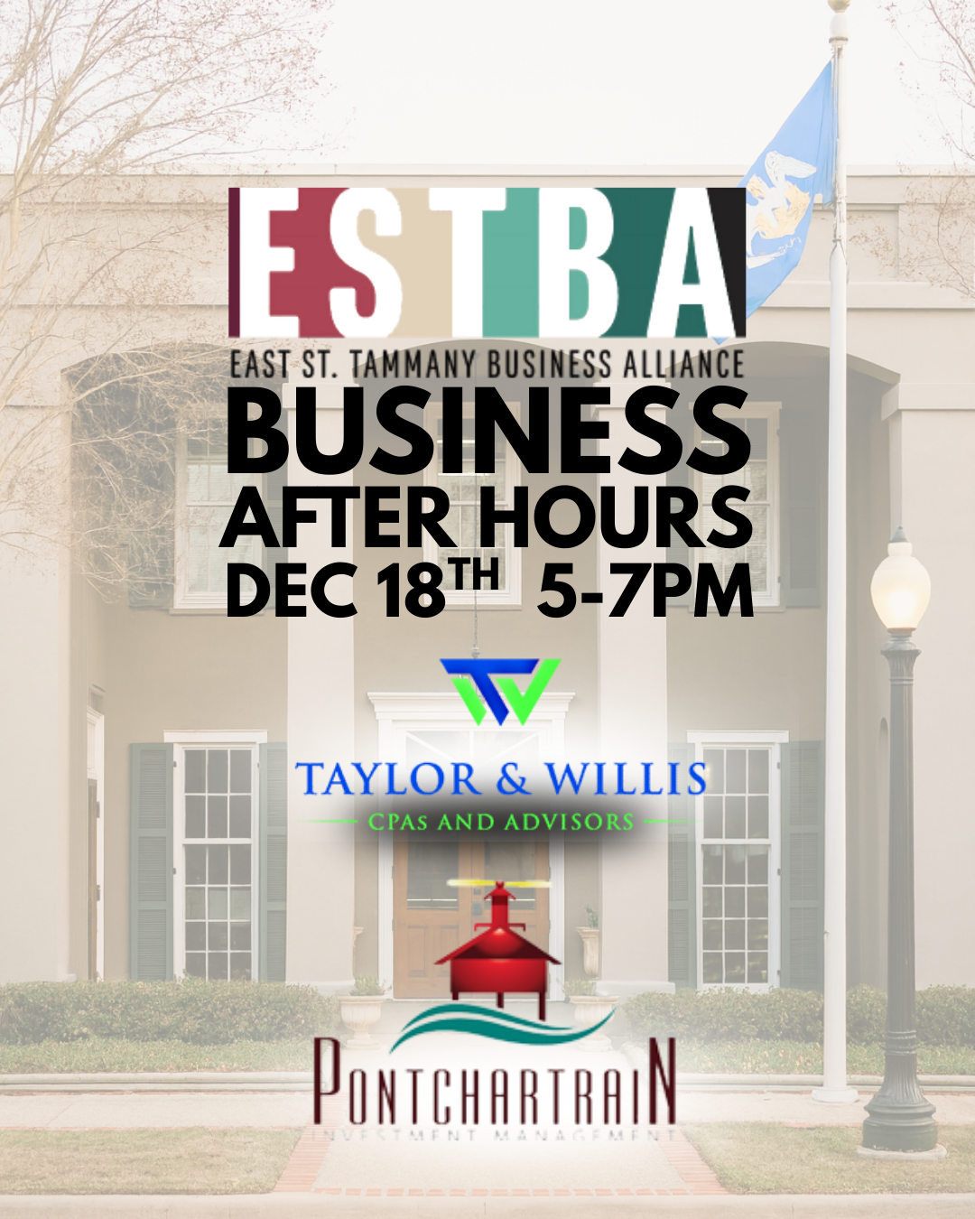 Join us for an evening of networking and community connection at Business After Hours hosted by Pontchartrain Investments & Taylor-Willis. This casual after-work event is the perfect chance to meet fellow professionals, build relationships, and discover more about the businesses shaping East St. Tammany.