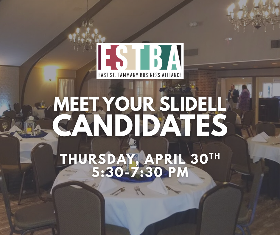 Join the East St. Tammany Business Alliance for Meet Your Slidell Candidates on Thursday, April 30 from 5:30–7:30 PM at Pinewood Country Club. This event offers members and community stakeholders the opportunity to hear directly from the candidates seeking to serve the citizens of Slidell and to learn more about their priorities for our city.