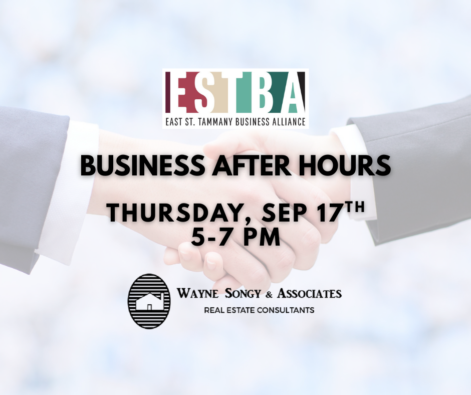 Join the East St. Tammany Business Alliance for Business After Hours on Thursday, September 17 (5:00–7:00 PM), hosted by Wayne Songy in Slidell. This event offers members the opportunity to connect in a more personal setting and get to know one of the professionals actively involved in our local business community.